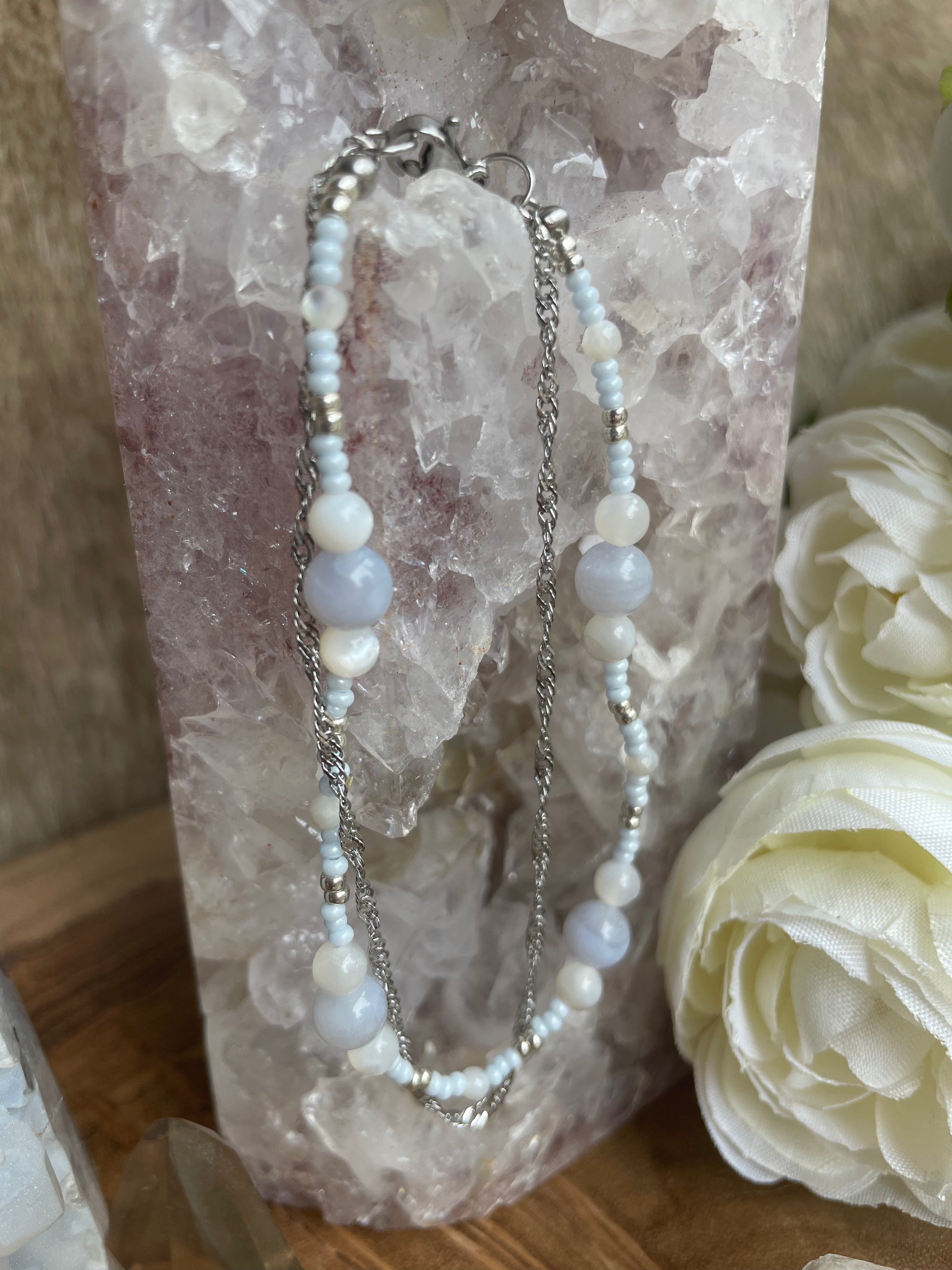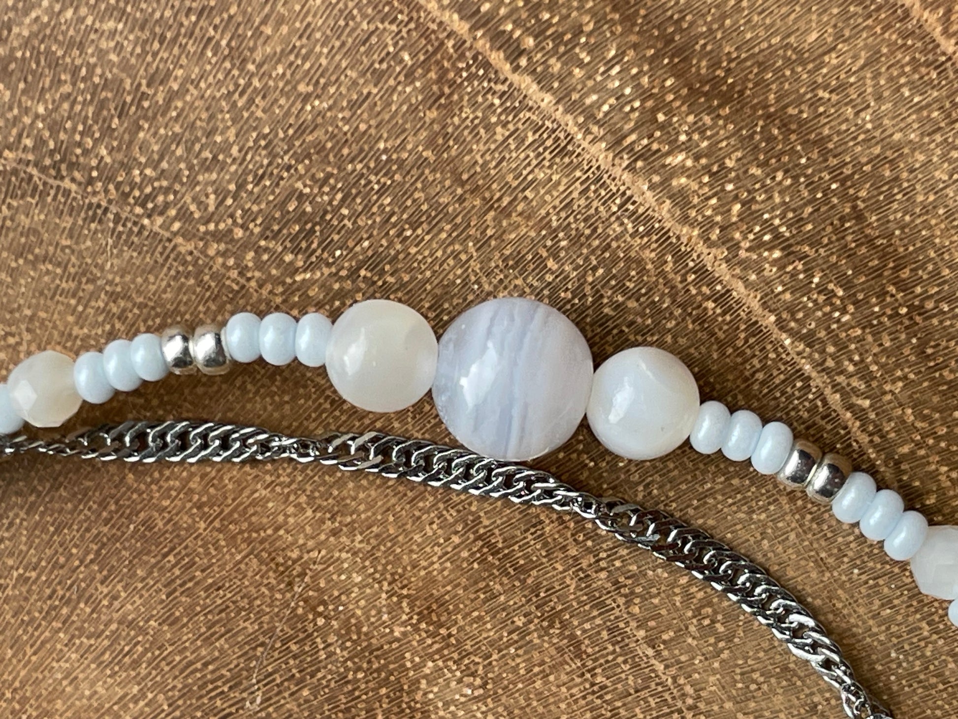 Un bracelet simple argenté, passe-partout, qui met en avant la beauté des pierres de calcite bleue ! Fin, il est parfait pour ceux qui aiment parer leur bras de nombreux bracelets.