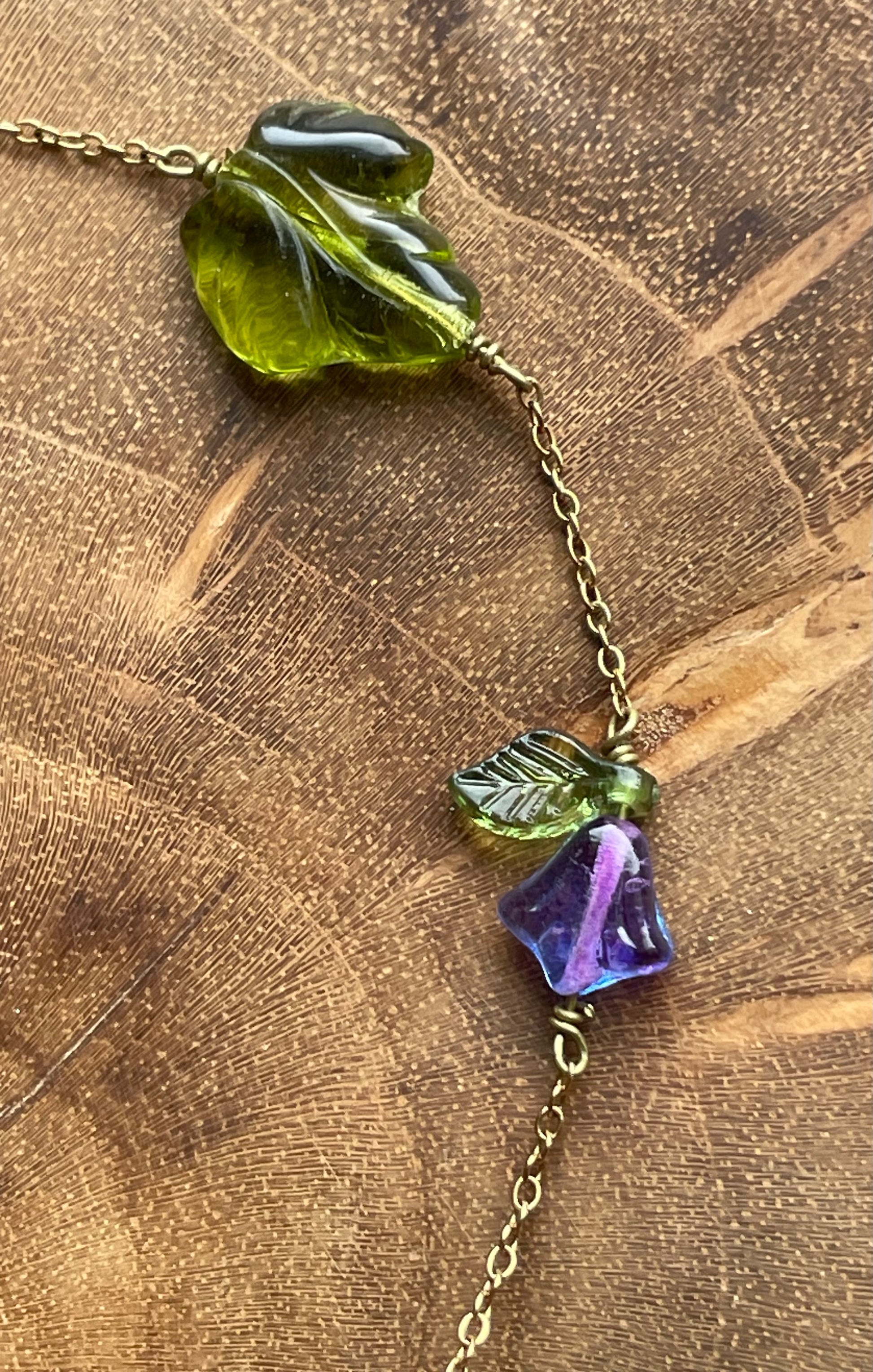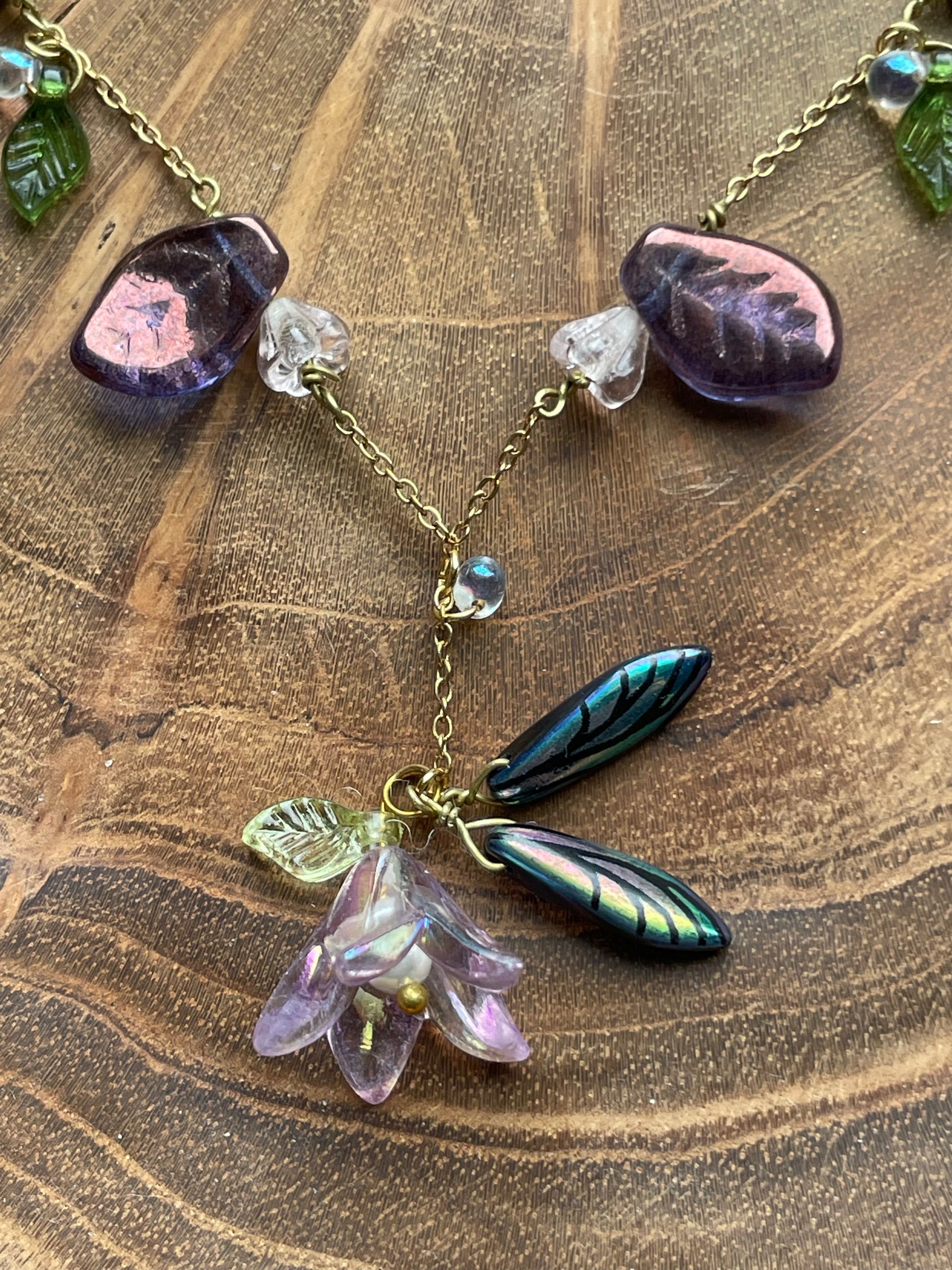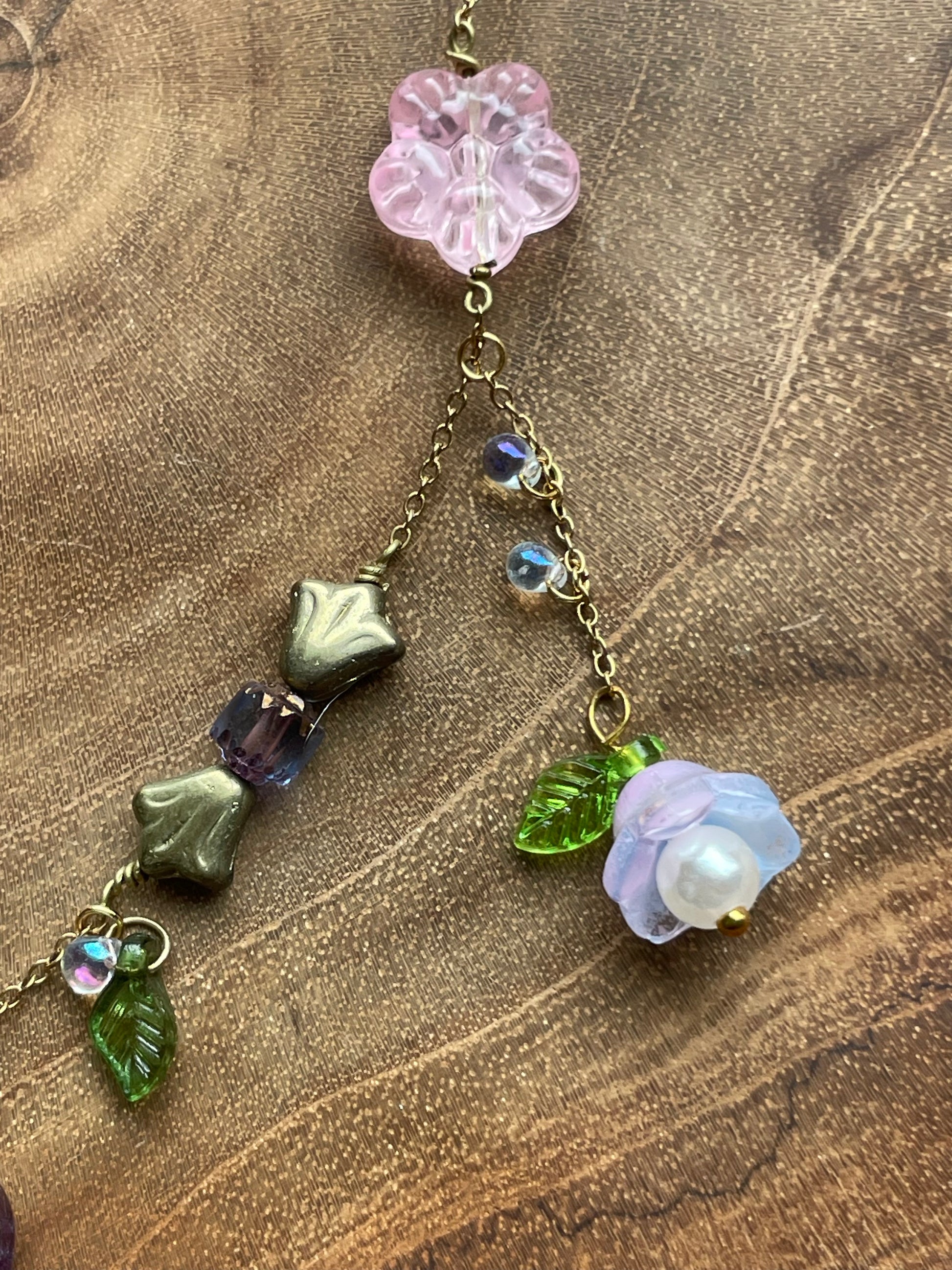 - Perles en verre : feuilles de vigne, lily flowers violettes et doré, marguerites roses, fleurs cloches bicolores, feuilles ondulées violettes, mini fleurs en cloche rose pâle, ailes de fées, mini feuilles vertes, perles type antique couleur violet pâle