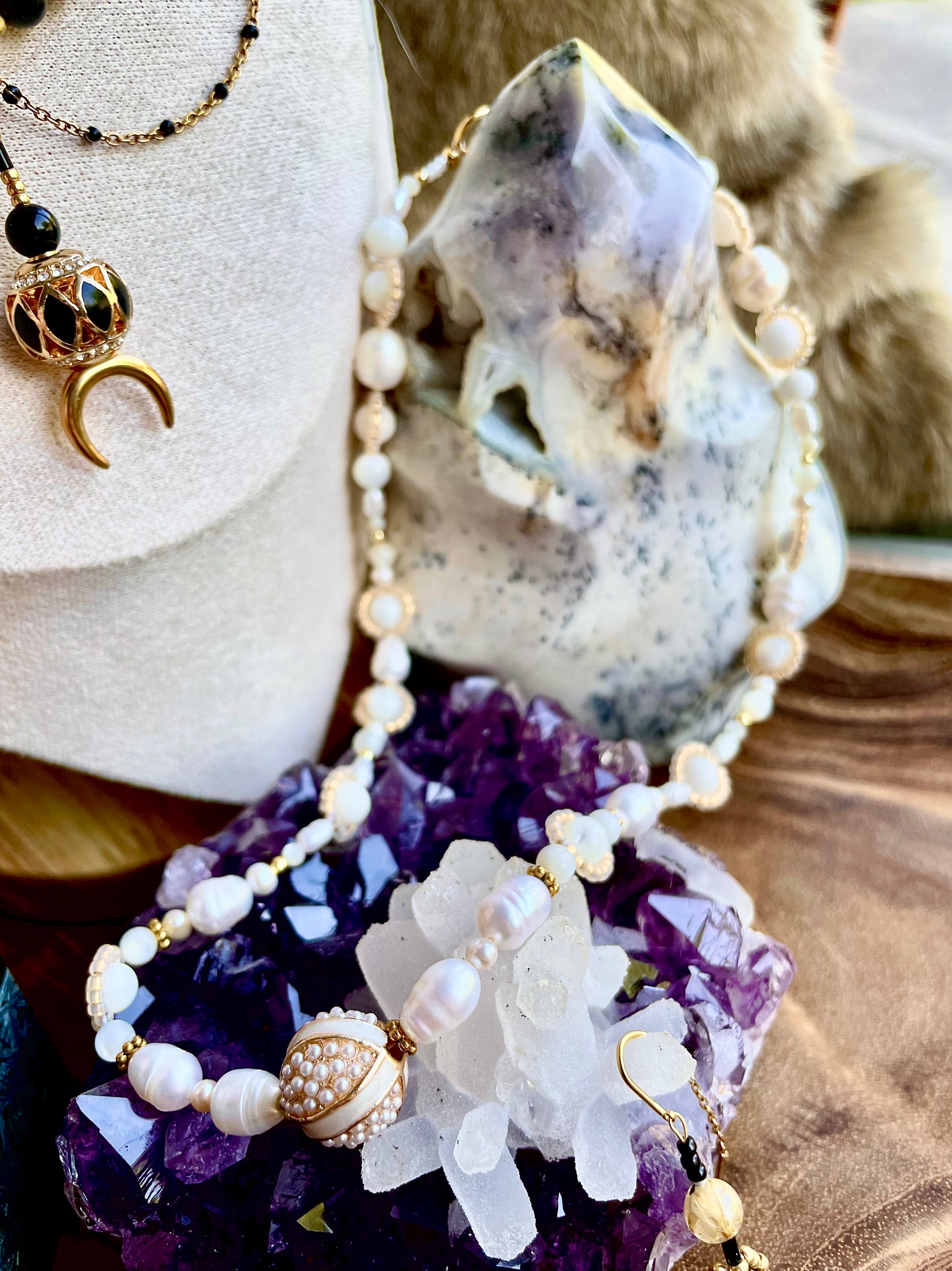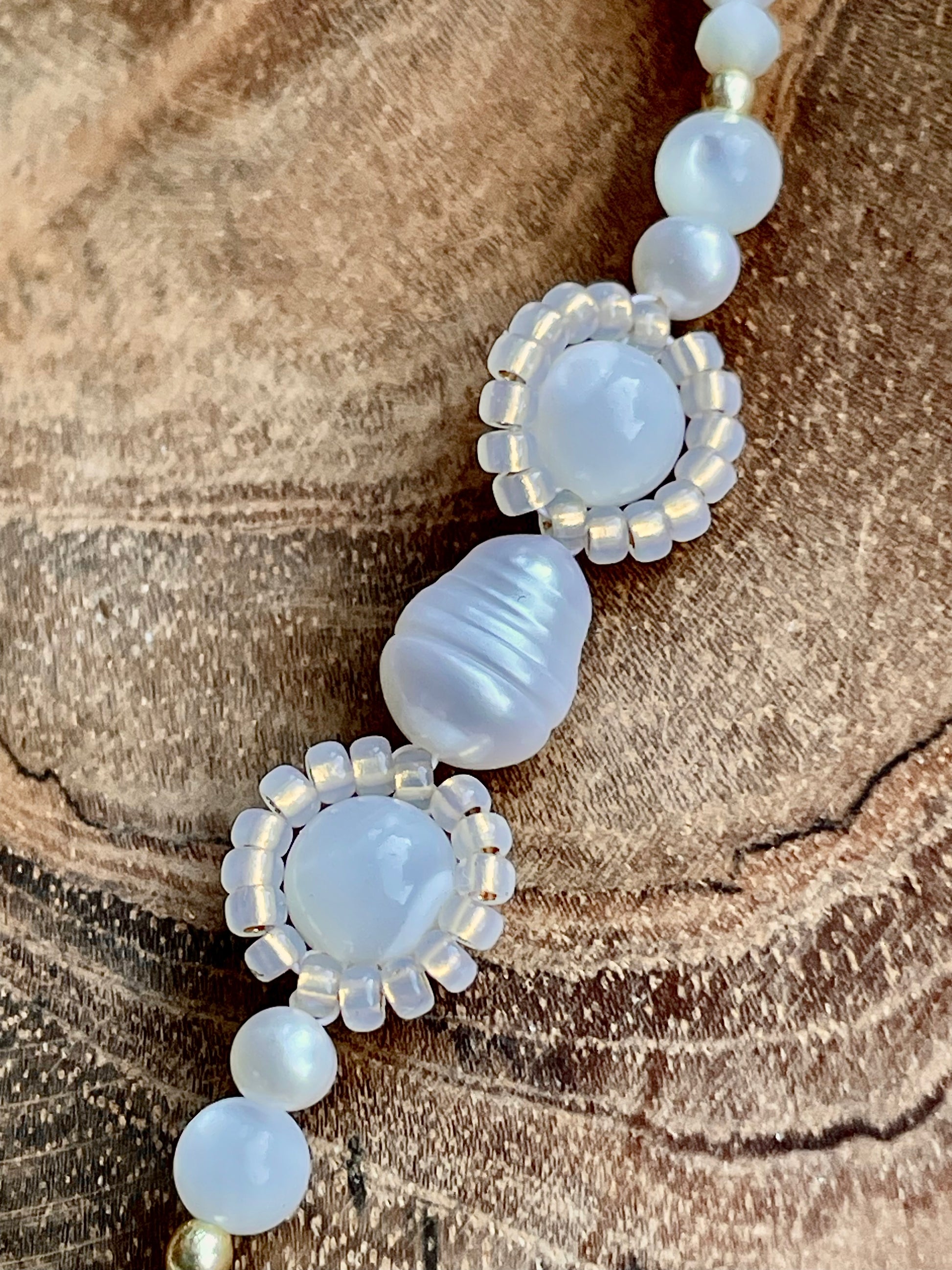 - Pierres naturelles : nacre facettée et ronde, pierre de lune, perles d'eau douce de diverses tailles