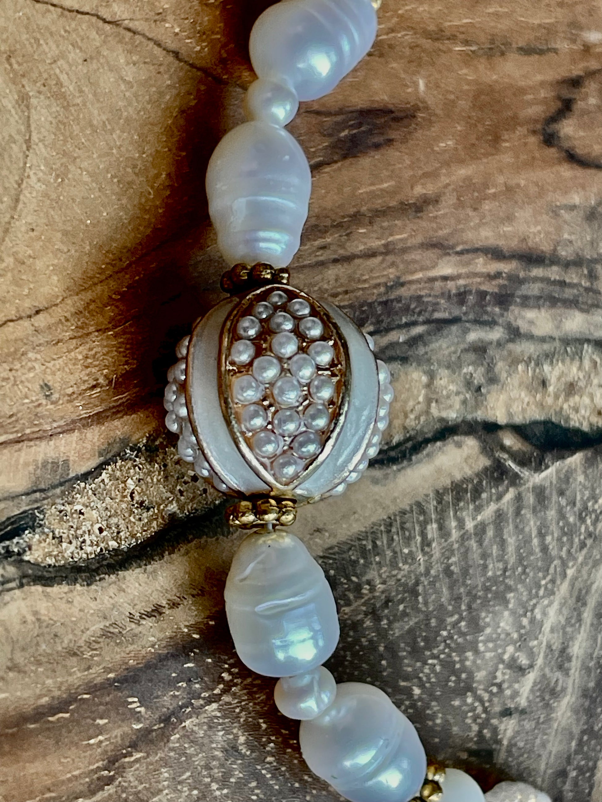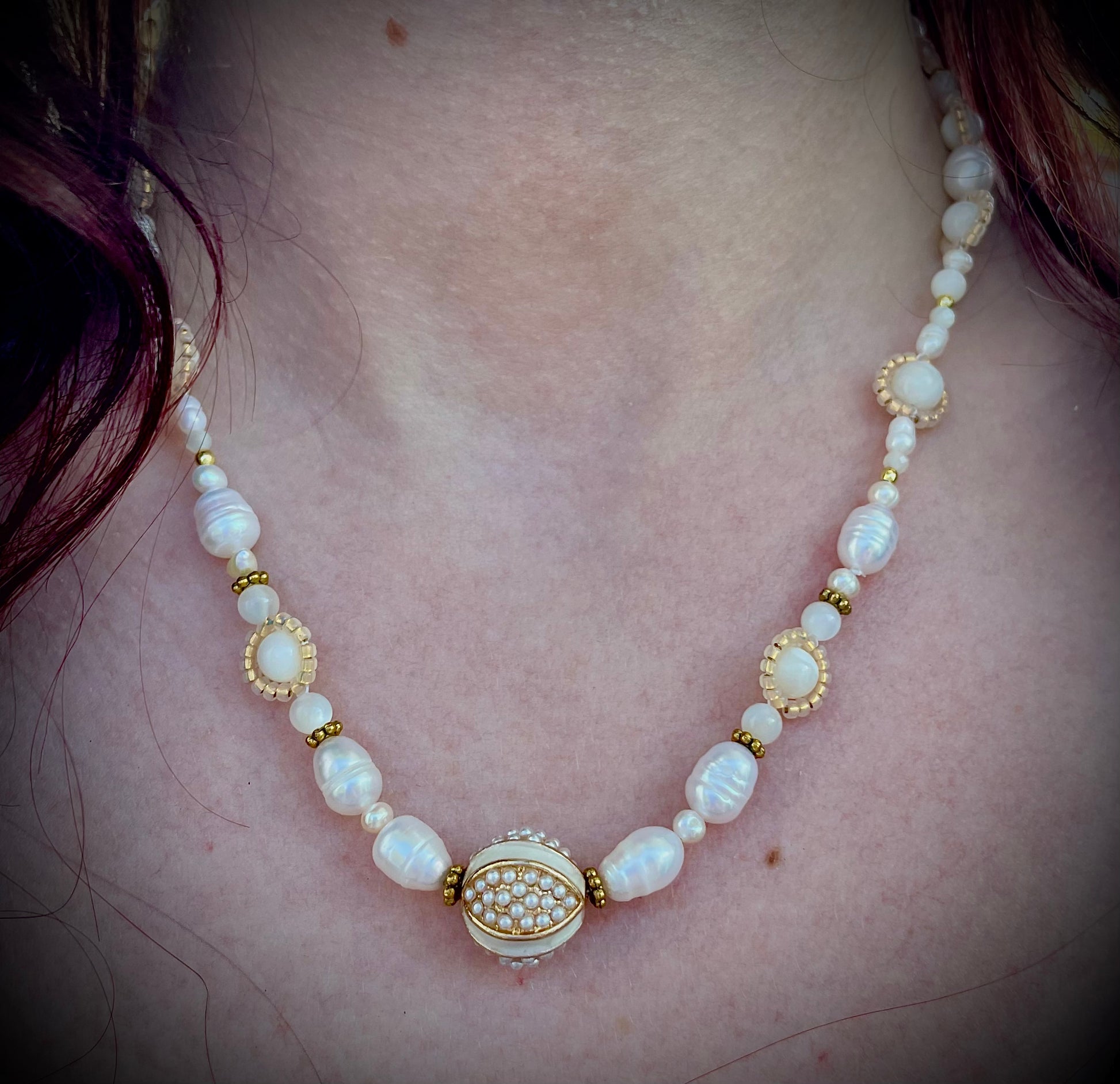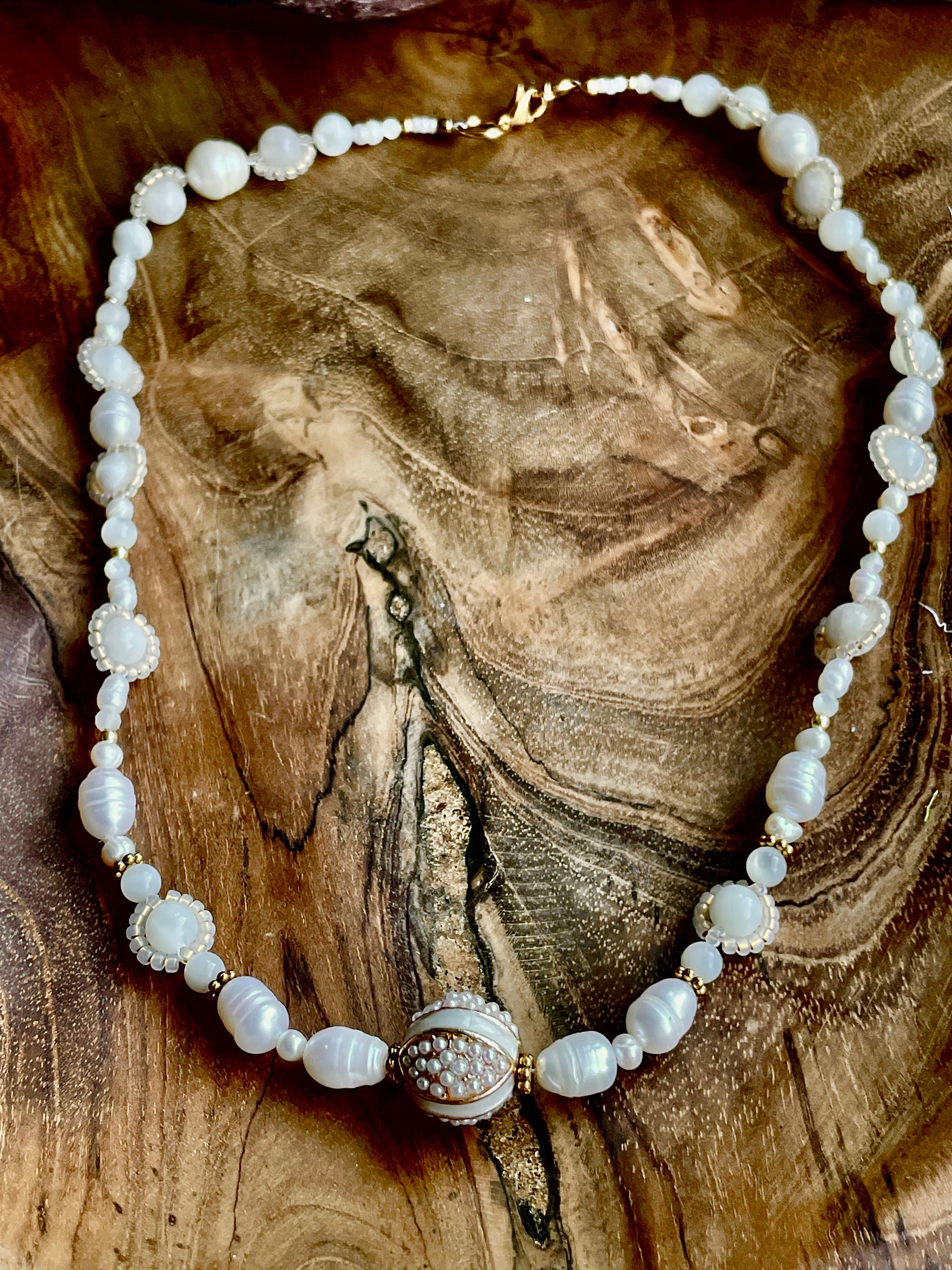 LE collier qui a inspiré la collection déesse. J'adorais cette perle de bohème, centrale au collier, et j'ai donc voulu la mettre en avant, en restant dans ses propres tons : blanc et or. C'est là qu'est né ce collier, paré de pierres naturelles, de nacre et de perles d'eau douce, qui m'a tout de suite rappelé Vénus, et notamment sa représentation par le peintre Milo.