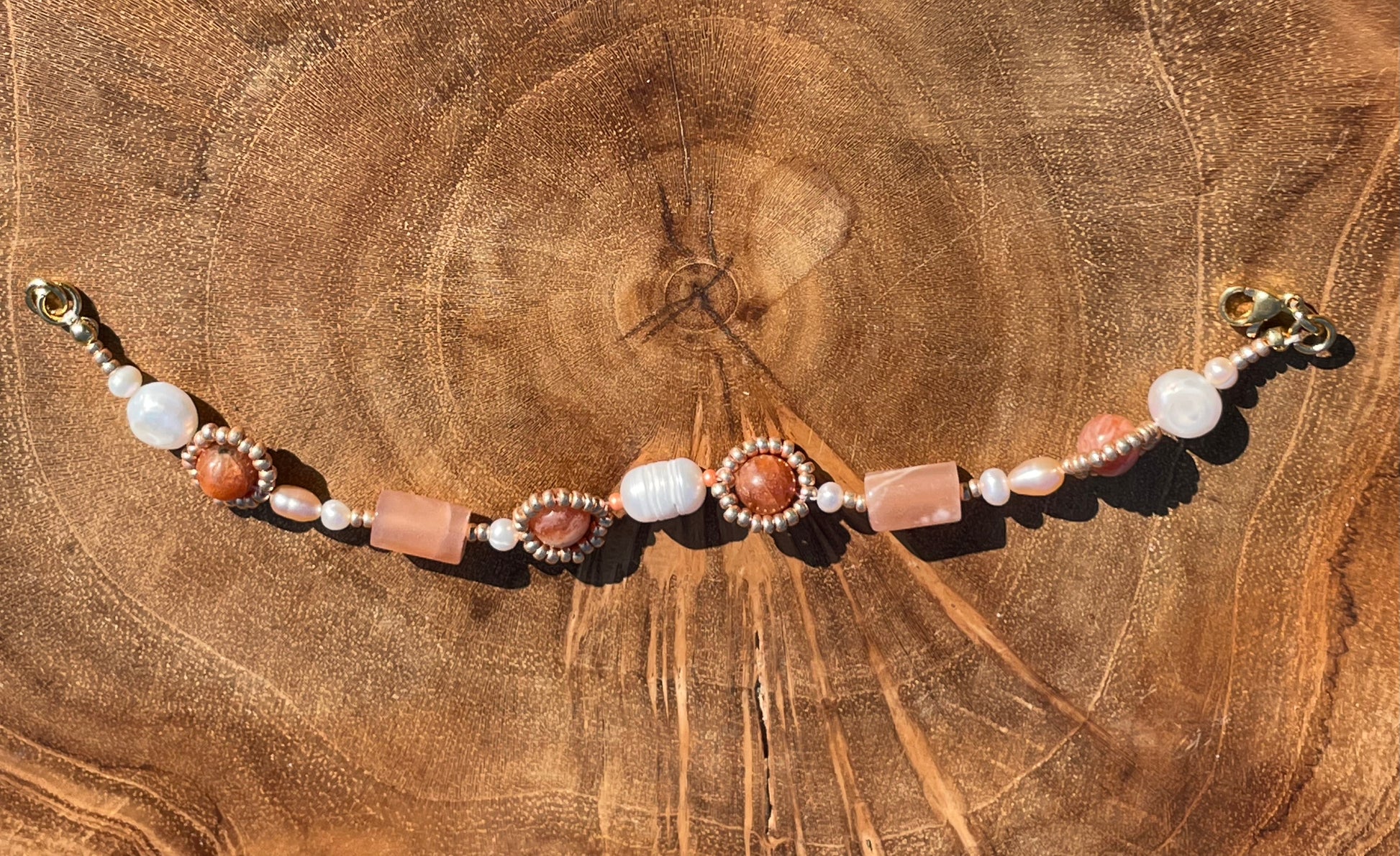 - Pierres naturelles : perles d'eau douce blanche et pêche de tailles diverses, pierres de soleil rondes AA, et colonne en pierre du soleil.