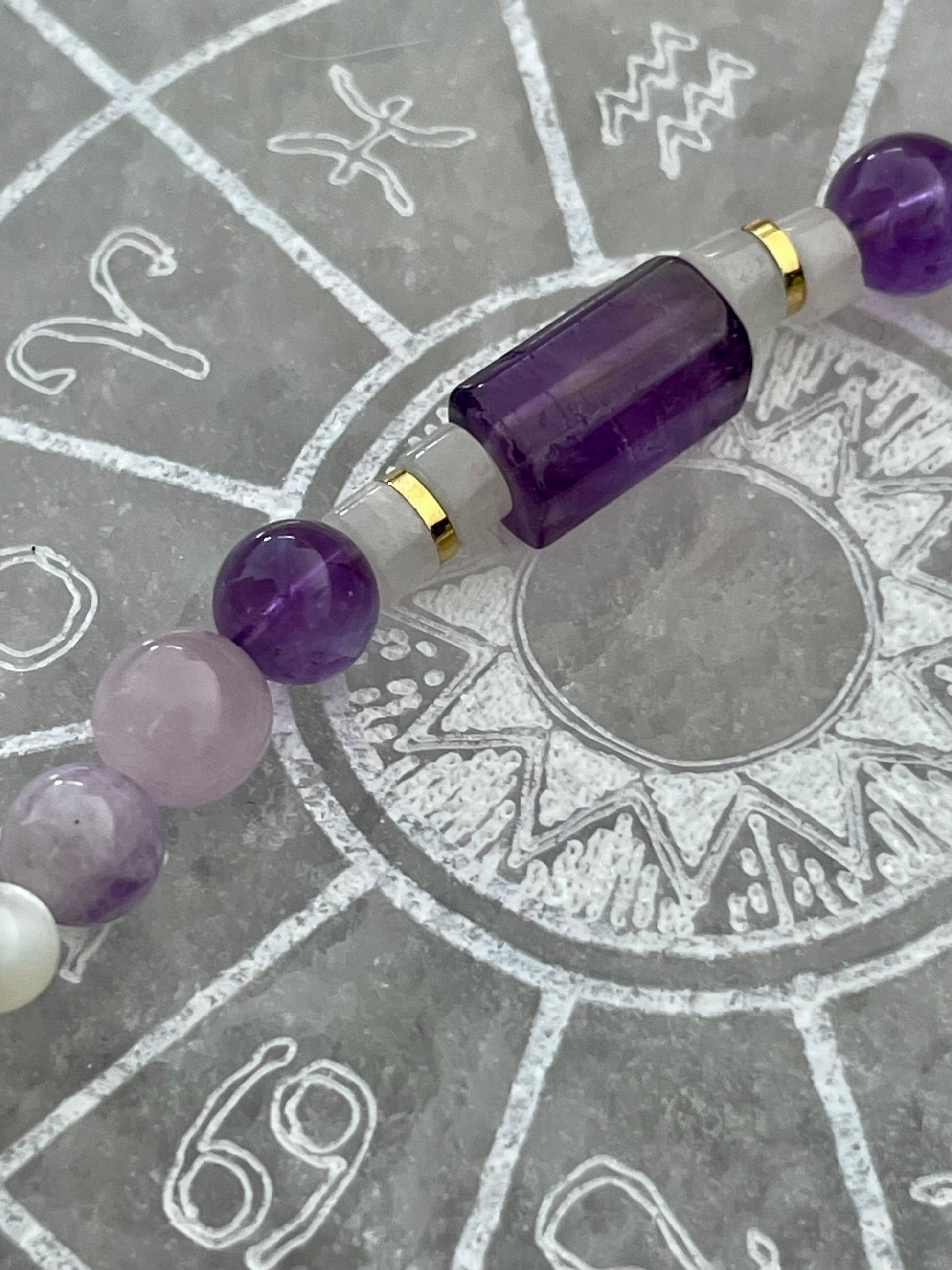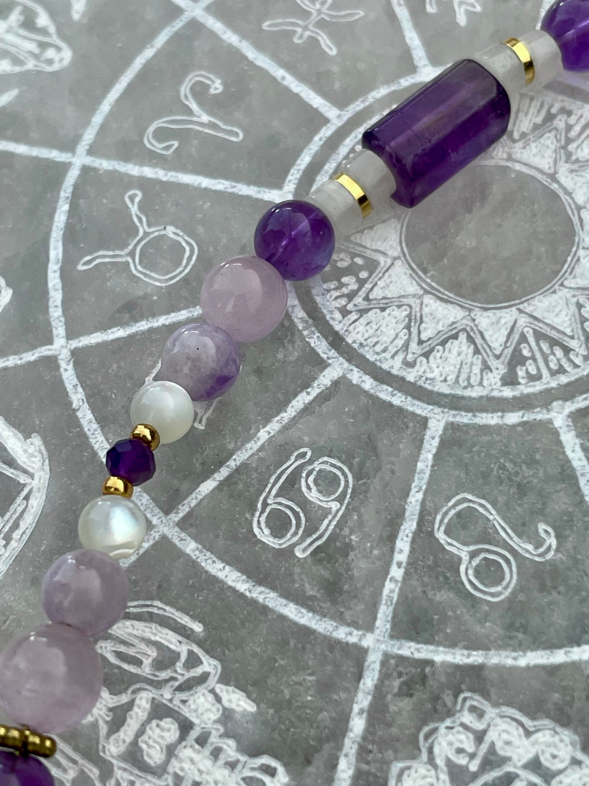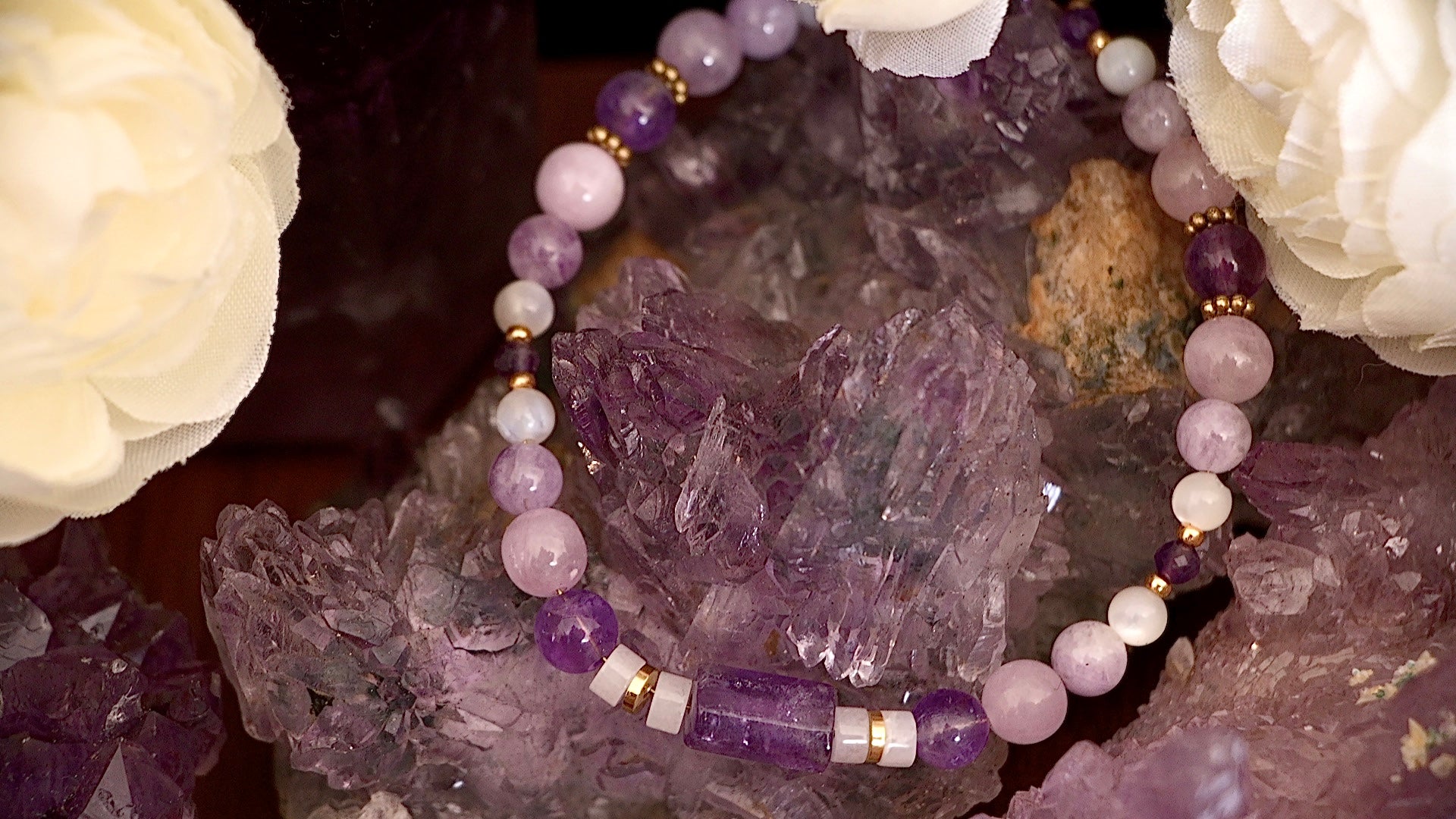 - Pierres naturelles : améthyste ( tube, facettée 3A, ronde AA ), améthyste lavande 3A, nacre ronde A, kunzite ronde AA, jade blanche heishi