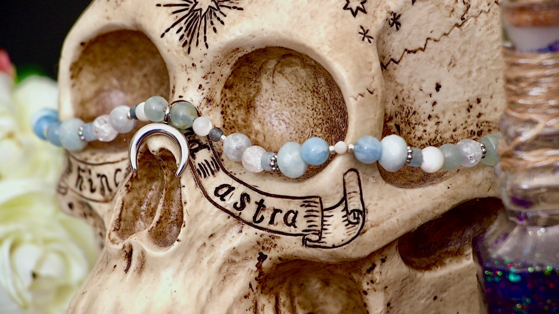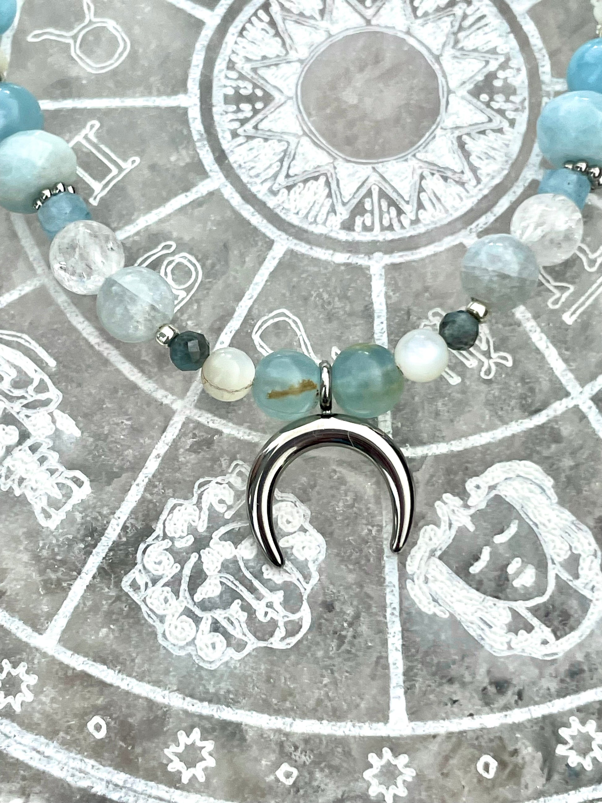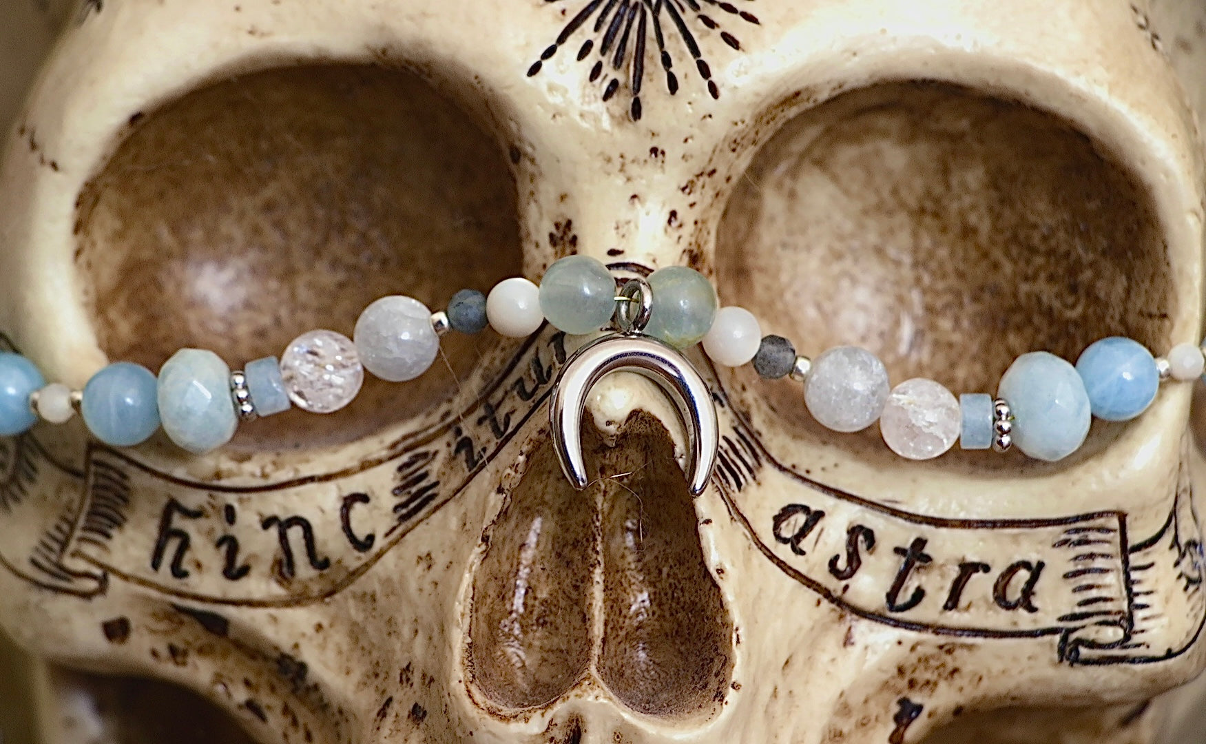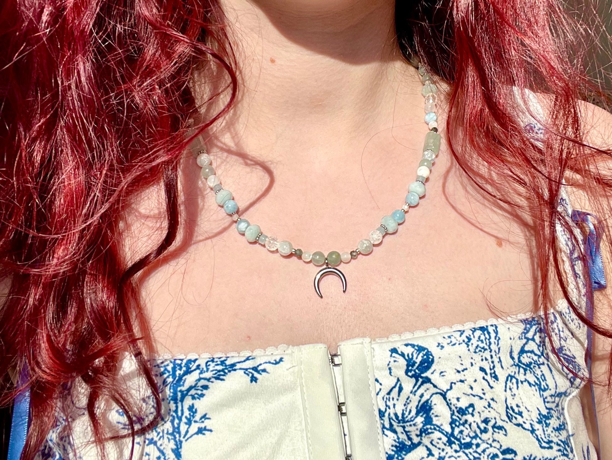 Ce n'est pas nouveau : j'adore tout ce qui est en forme de lune, et je la guette de ma fenêtre presque chaque soir. Alors quand j'ai commandé ces pendentifs, je savais que j'allais rapidement les utiliser ! C'est autour donc du pendant que j'ai crée ce modèle. Une lune argentée, entourée de couleurs douces, rappelant les nuits paisibles de la campagne. Mais étonnamment, je n'ai pas utilisé de pierre de lune pour ce modèle ! J'avais envie de mettre en avant le bleu clair de l'aigue marine, de la célestine et de la calcite, et les reflets de mes pierres de lune prenaient trop le dessus, avec ses couleurs presqu'électriques. J'ai préféré alors contraster avec de la nacre blanche, et du quartz crack, ajoutant ainsi une pointe de brillance sans qu'elle ne prenne le dessus, mais qu'elle sublime la parure, notamment sous la lumière.