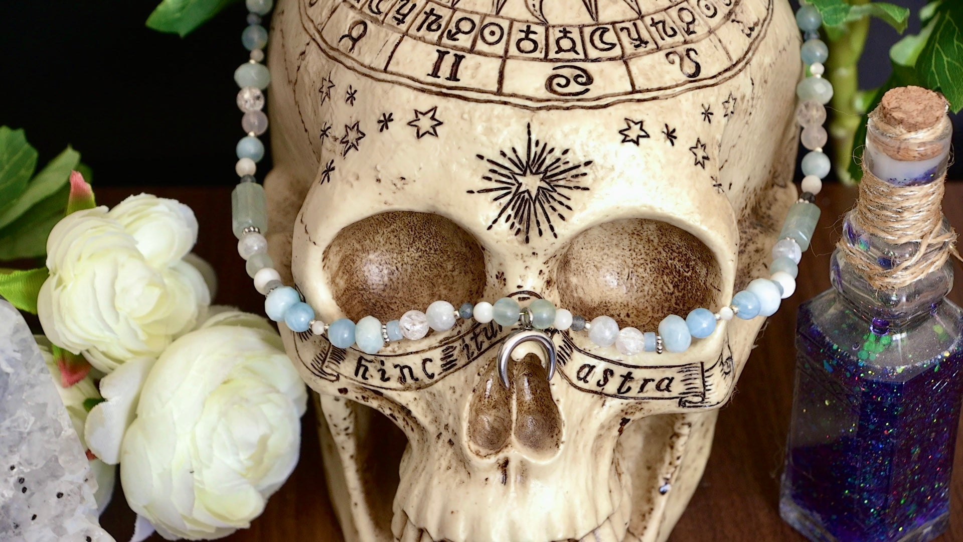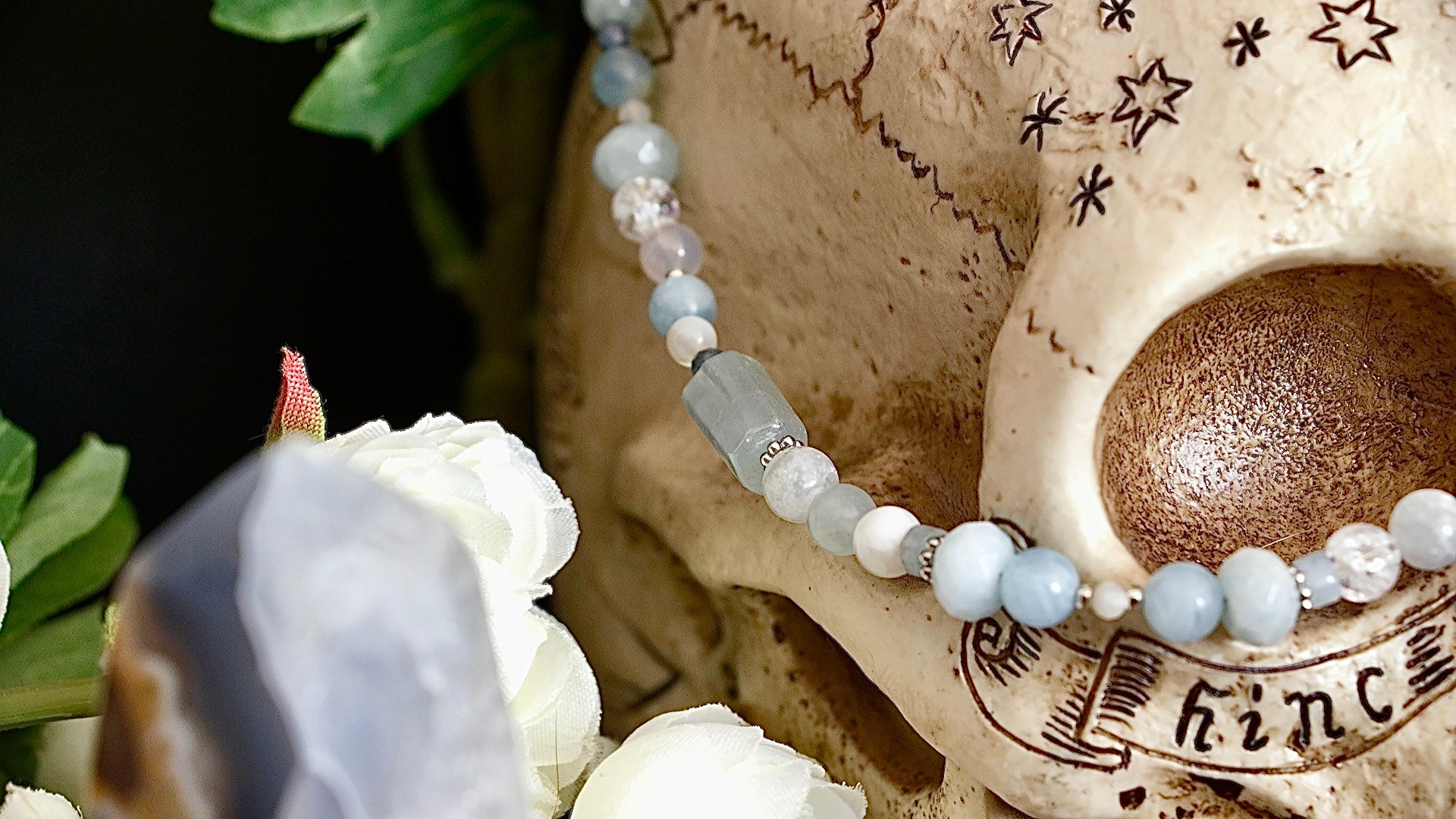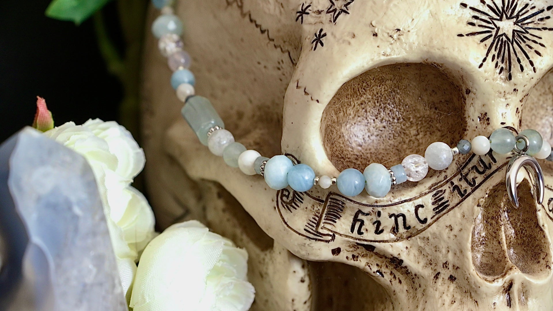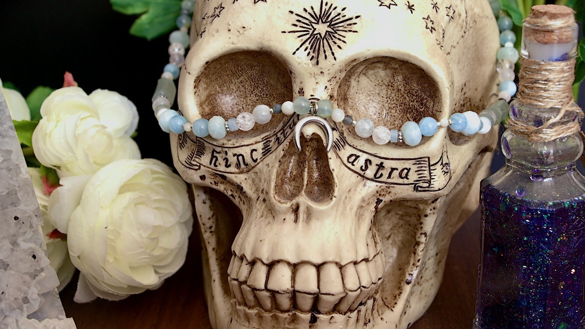 Ce n'est pas nouveau : j'adore tout ce qui est en forme de lune, et je la guette de ma fenêtre presque chaque soir. Alors quand j'ai commandé ces pendentifs, je savais que j'allais rapidement les utiliser ! C'est autour donc du pendant que j'ai crée ce modèle. Une lune argentée, entourée de couleurs douces, rappelant les nuits paisibles de la campagne. Mais étonnamment, je n'ai pas utilisé de pierre de lune pour ce modèle ! J'avais envie de mettre en avant le bleu clair de l'aigue marine, de la célestine et de la calcite, et les reflets de mes pierres de lune prenaient trop le dessus, avec ses couleurs presqu'électriques. J'ai préféré alors contraster avec de la nacre blanche, et du quartz crack, ajoutant ainsi une pointe de brillance sans qu'elle ne prenne le dessus, mais qu'elle sublime la parure, notamment sous la lumière.