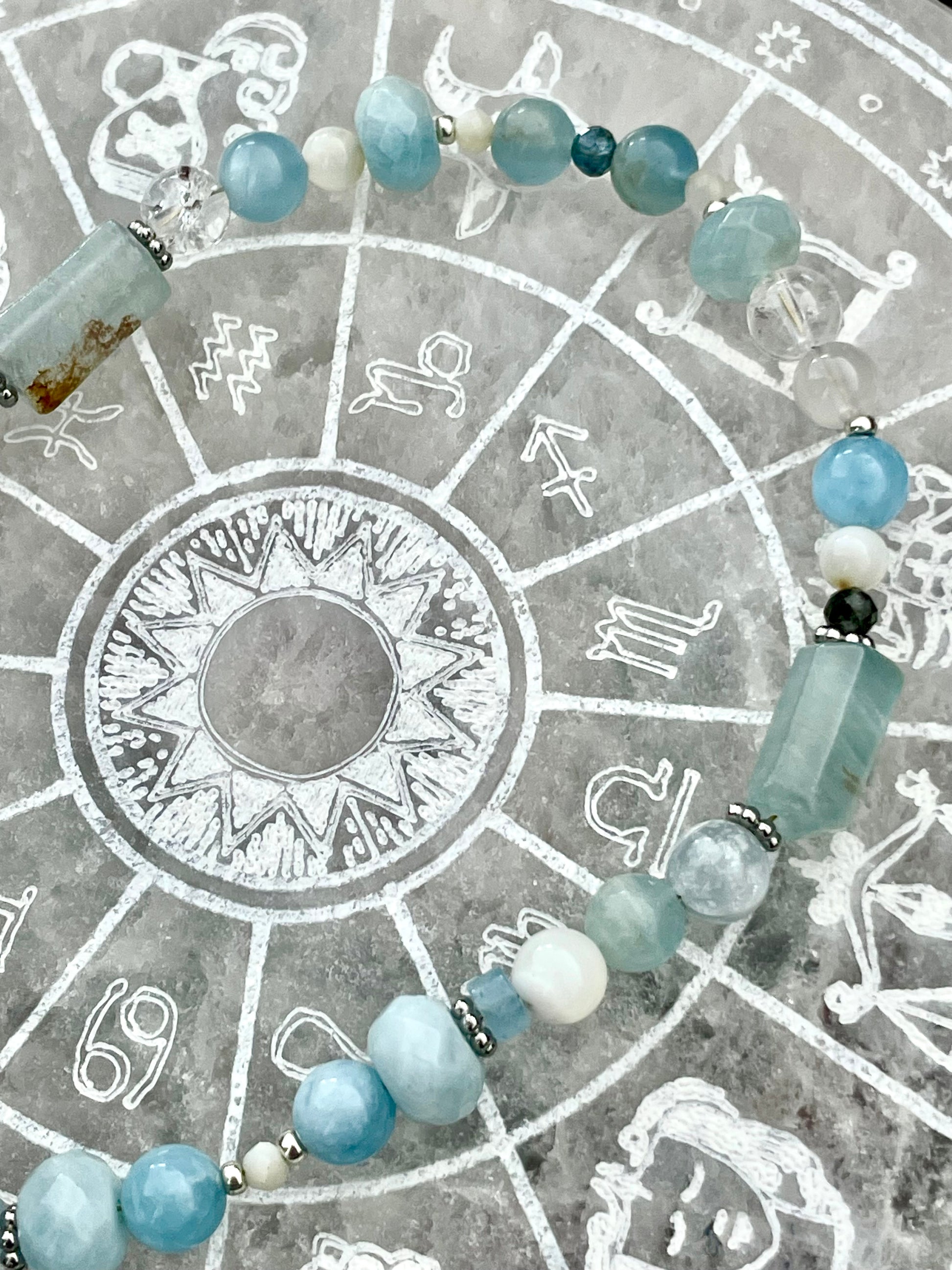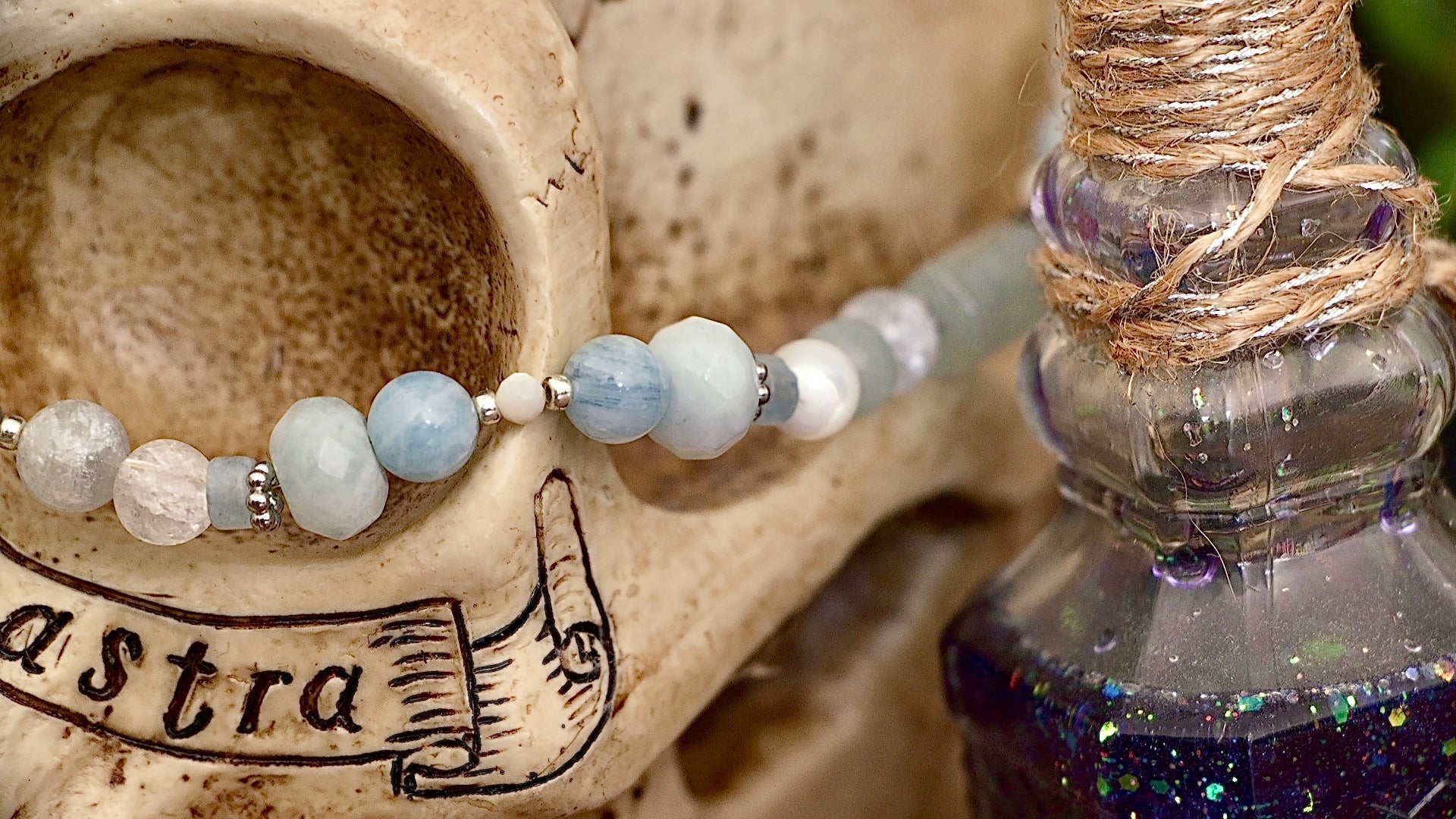 - Pierres naturelles : aigue marine ( rondes AA, heishi, rondelles ), aigue marine avec inclusion de tourmaline facettée, nacre ( ronde A, facettée ), célestine ronde A, calcite aqua-lémurienne ( tube, ronde ), quartz crack rond A, agate fleur de cerisier ronde A