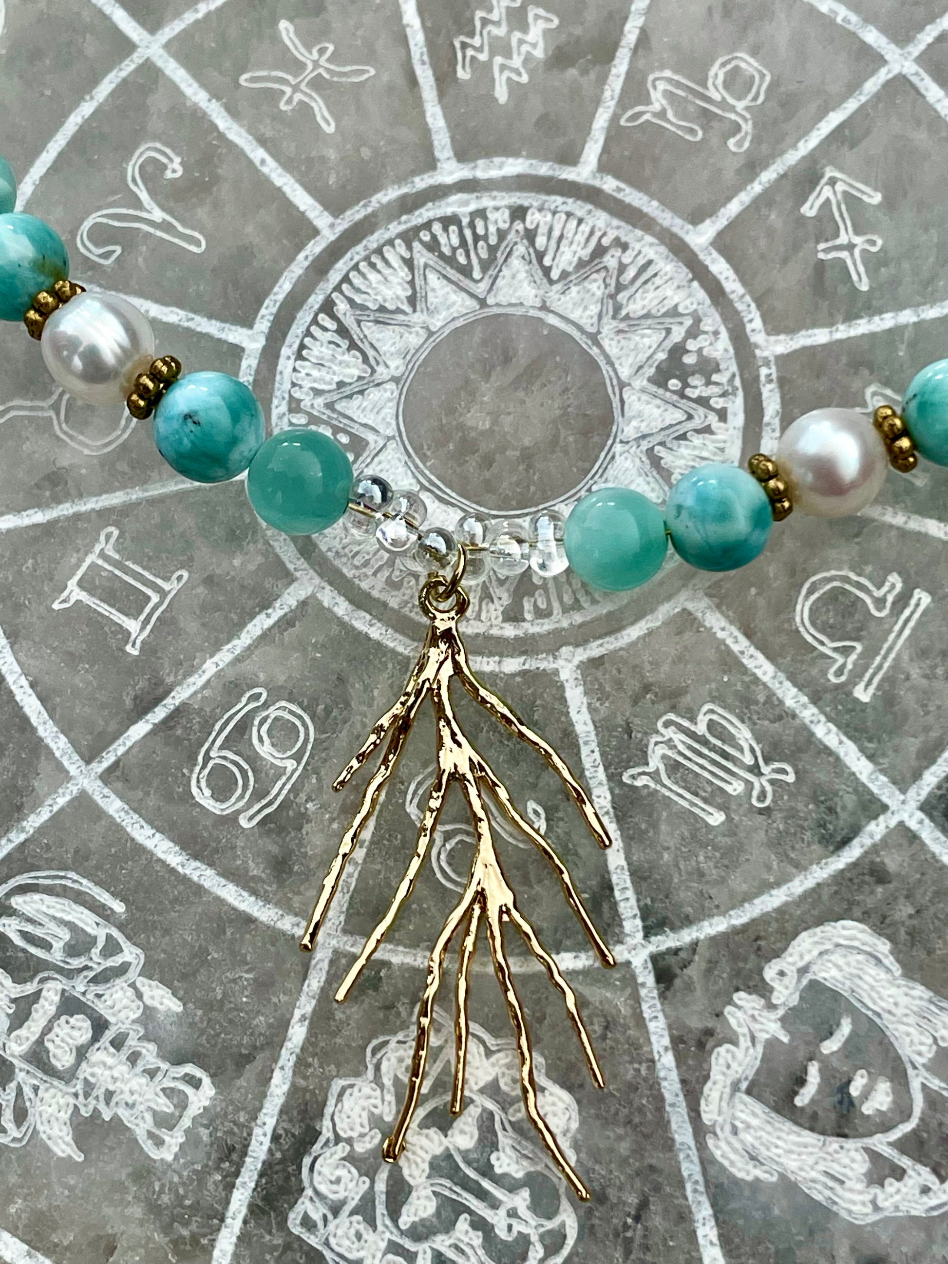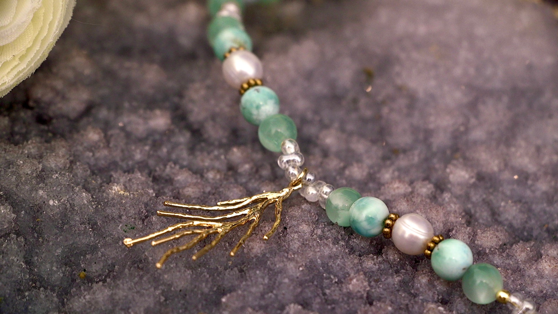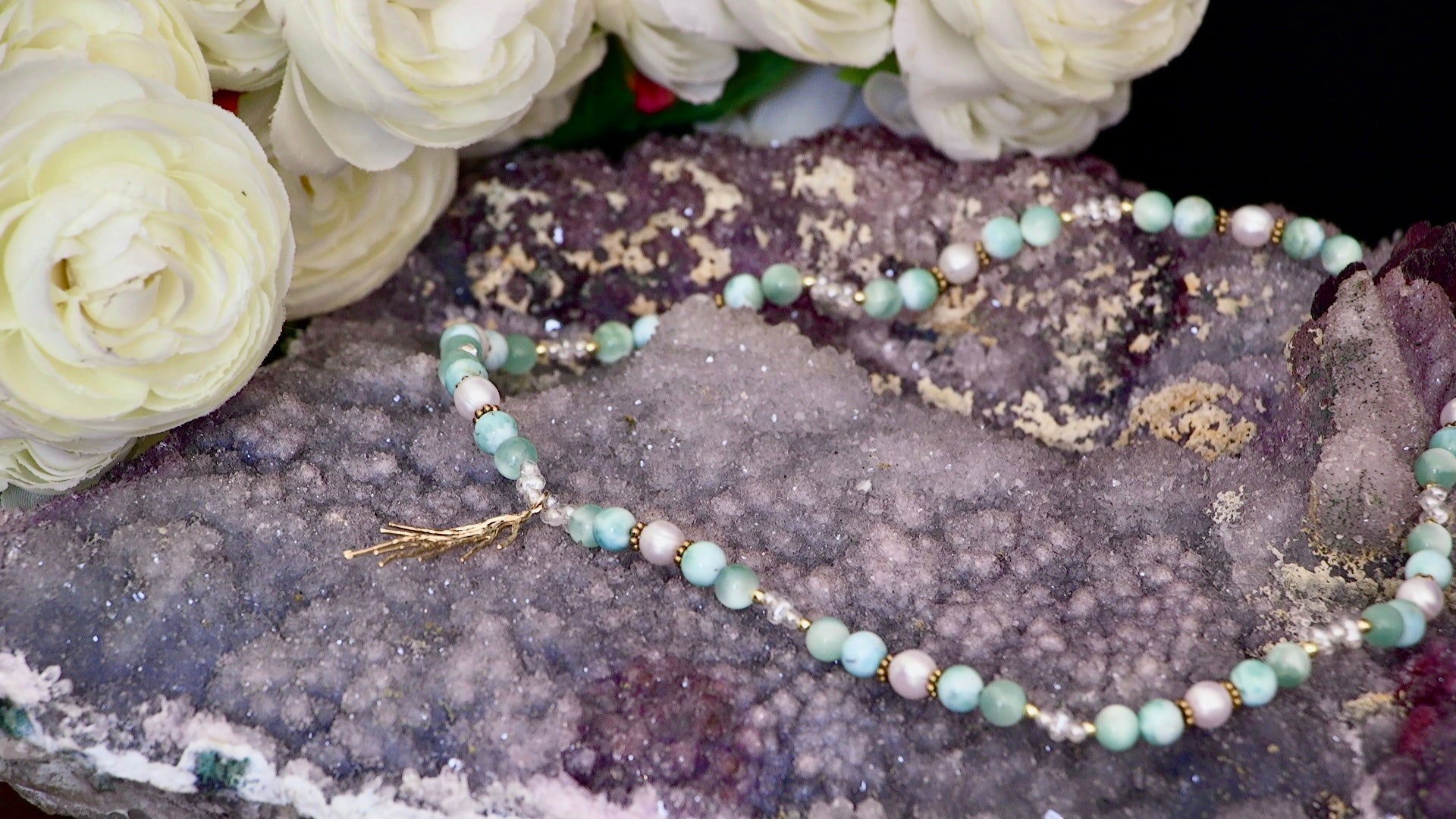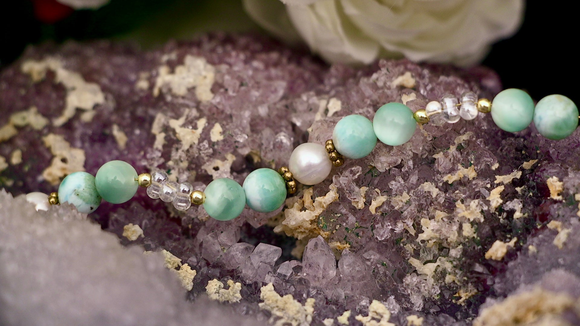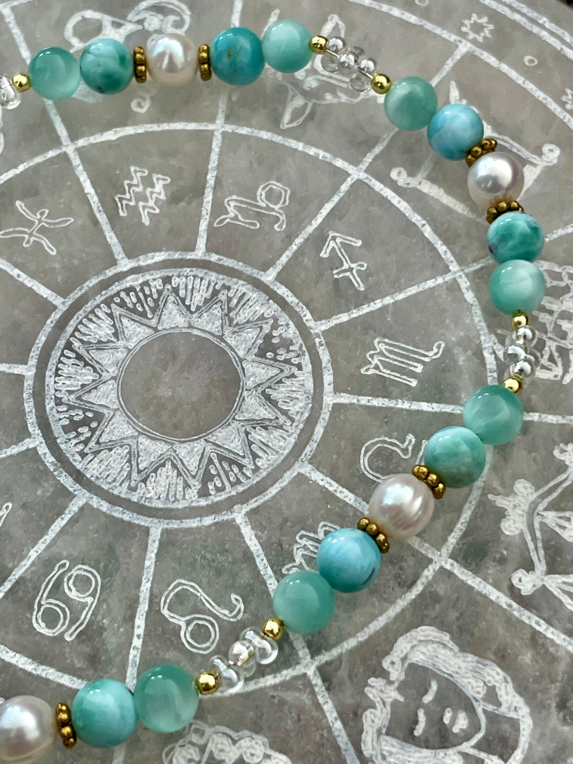 - Pierres naturelles : perle d'eau douce A, larimar rond AA, angélite du brésil ronde