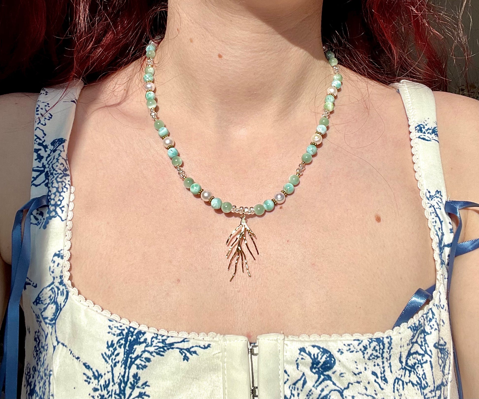 Une vraie bouffée d'été, le corail et les teintes bleues et blanches qui rappellent la plage... De quoi ensoleiller cette saison, qui manque cruellement de beau temps ! Pour cette incroyable pièce, j'ai choisi de faire un motif récurrent autour de deux pierres naturelles et de perles d'eau douce, accentué avec des rocailles et des intercalaires en fleurs dorées, ainsi que des points de brillances avec des gouttes doubles transparentes légèrement irisées. On y retrouve tout le thème des vacances à lézarder sur la plage : le corail de la mer, la couleur dorée du soleil, le larimar dont les motifs tortueux ressemblent aux mouvements de la mer et de l'écume, la transparence des gouttes d'eau de mer sur la peau. Un collier d'une qualité incroyable avec des pierres de haute qualité, que j'ai même hésité à garder pour moi...