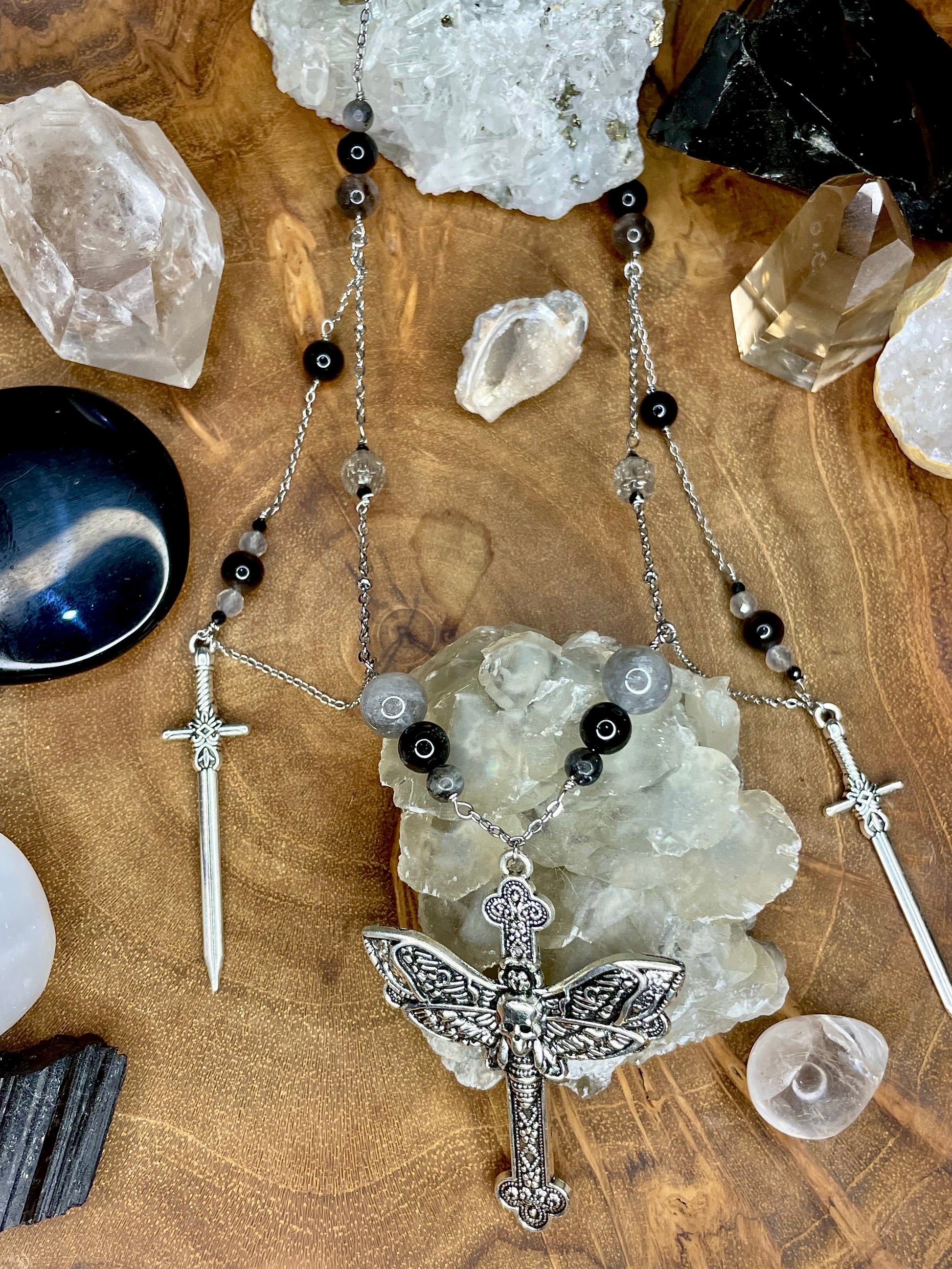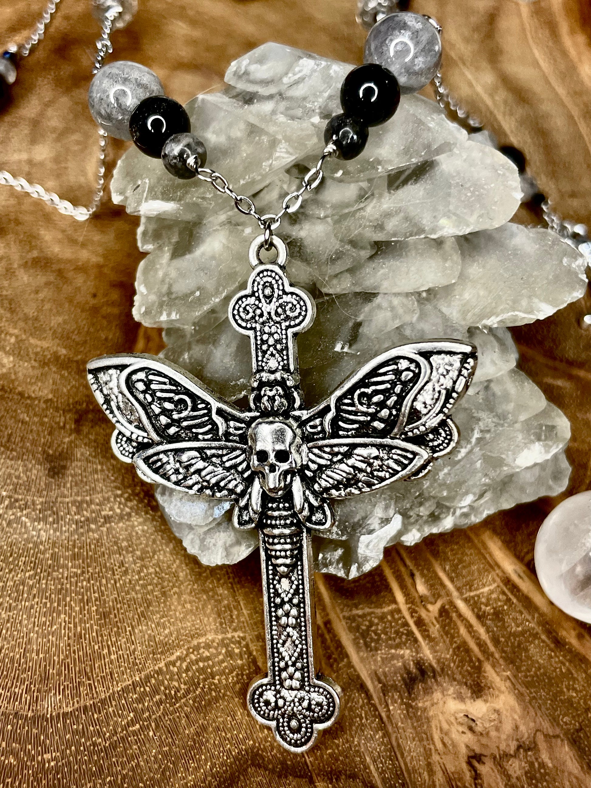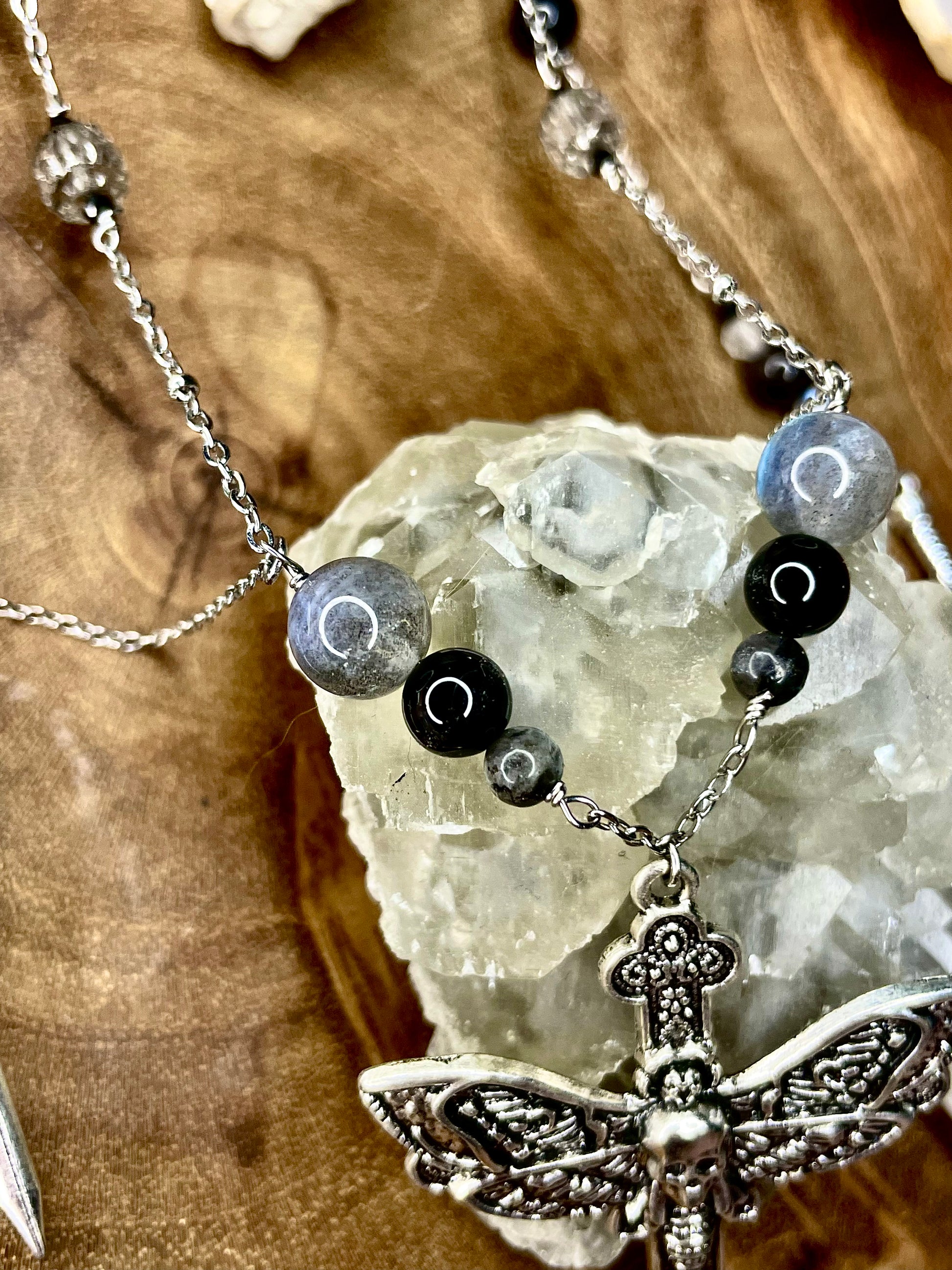 Un des tous premiers colliers que j'ai crée, et pourtant jamais mis en ligne avant. Plus ésotérique et sombre, aux reflets bleutés des labradorites, il est à la fois imposant et discret, parfait pour réveiller la sorcière en soi !